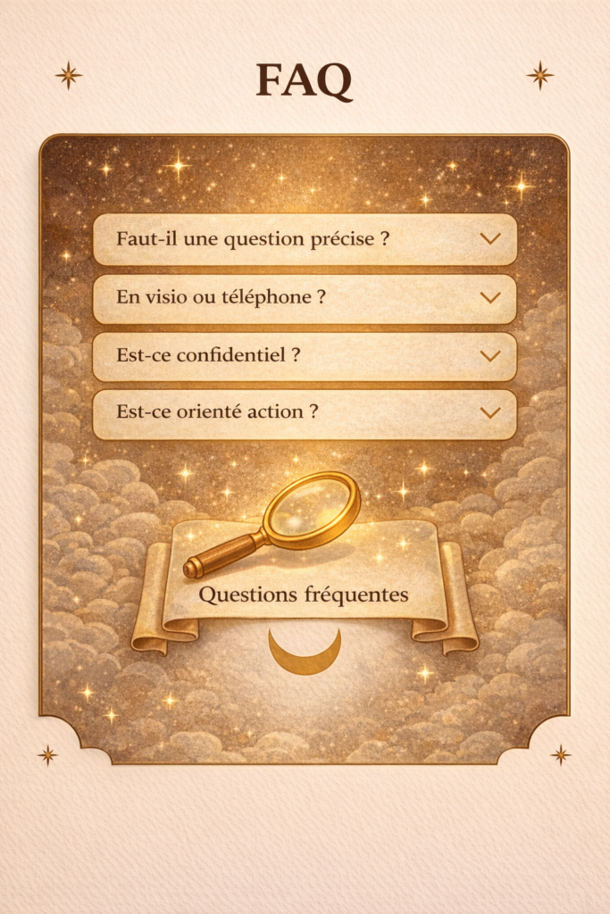 ⏳ Consultations en visio / téléphone • 🔒 Confidentialité • 🌙 Approche intuitive & structurée